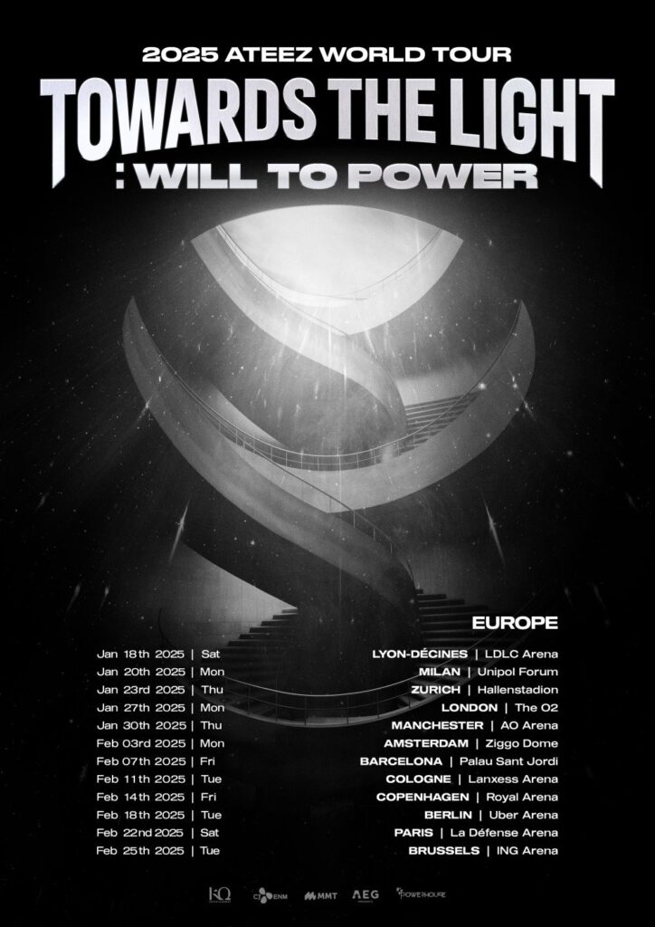 Recientemente, ATEEZ anunció las fechas de su gira mundial ‘Towards The Light: Will To Power’ por Europa, donde visitarán 12 ciudades entre enero y febrero de 2025. Con el tour, los chicos se presentarán en el estadio París La Défense Arena, el cual tiene una capacidad de aproximadamente 40 mil personas, lo que convierte a ATEEZ en el primer grupo de K-pop en presentarse en dicho lugar.
